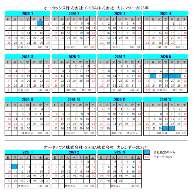 オータックス株式会社とSHIBA株式会社の2026年度の営業カレンダーを公開させていただきます。