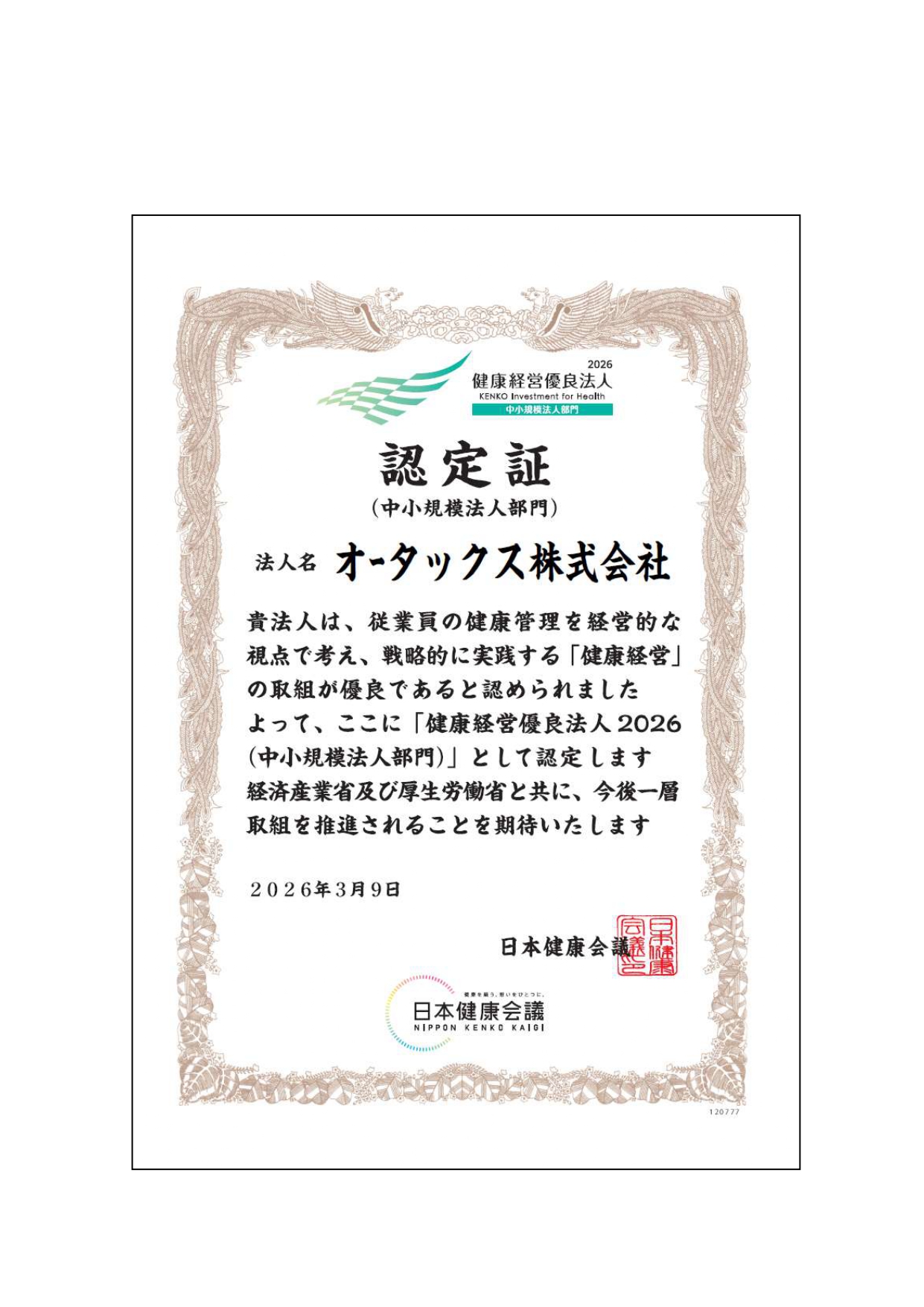 当社は2026年3月9日付で、経済産業省及び日本健康会議が 認定を行う「健康経営優良法人2025(中小規模法人部門)」に認定されました。