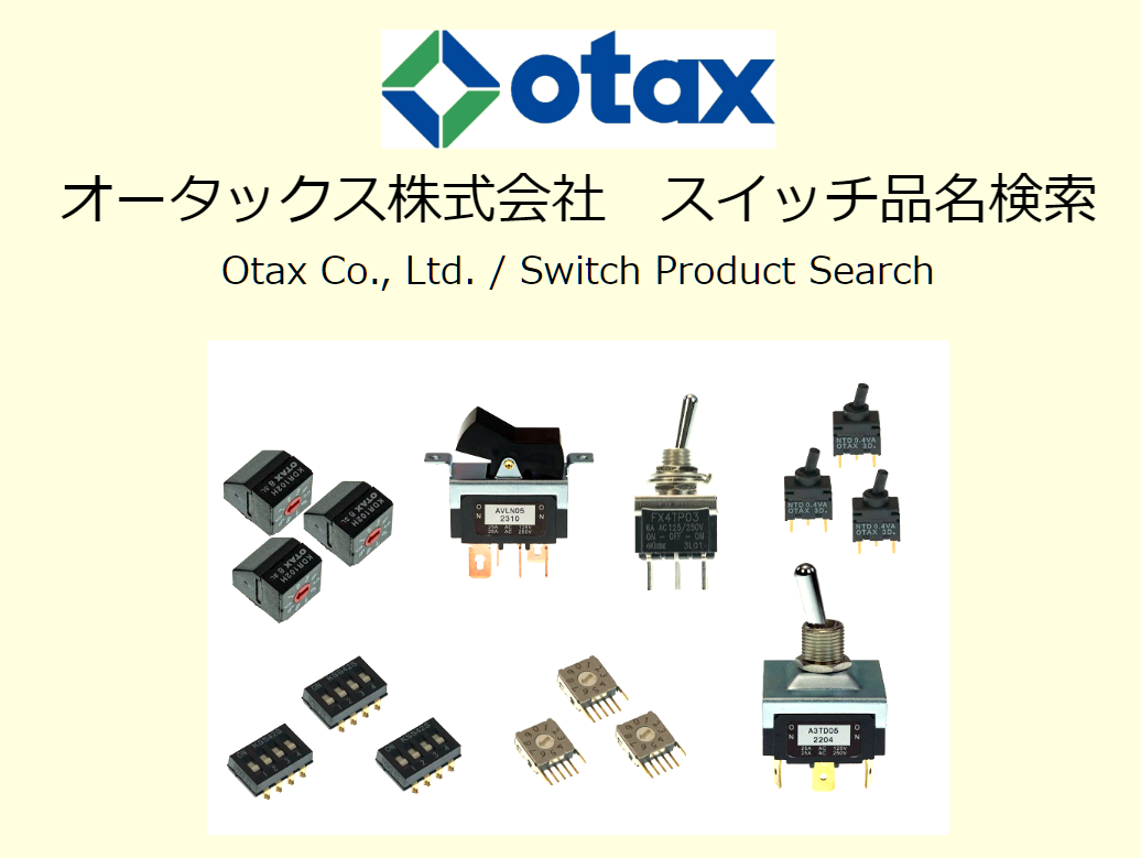 今般、オータックスHPの機能強化の一環として、オータックスのスイッチ製品の検索機能の提供を開始いたしました。DIPスイッチ、トグルスイッチ、ロッカースイッチ、押ボタンスイッチなどのオータックスのスイッチ製品につき、品名の一部を前方一致検索で検索したり、またはDIPスイッチのタイプ(スライド、ピアノ、ロータリー)や、操作用スイッチの操作部・シリーズ・極数・回路等を個別に指定して、該当する製品の写真や仕様を一覧で見ることが出来ます。また各製品のデータシートへのリンクも表示されます。