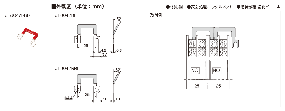 | JTJ047B□ | 黒、赤、白 | 2 | 25mm | WR6165、WR6166 | BR-12D、BR-22D、BR-121D、BR-221D | 20A | 10個入 |