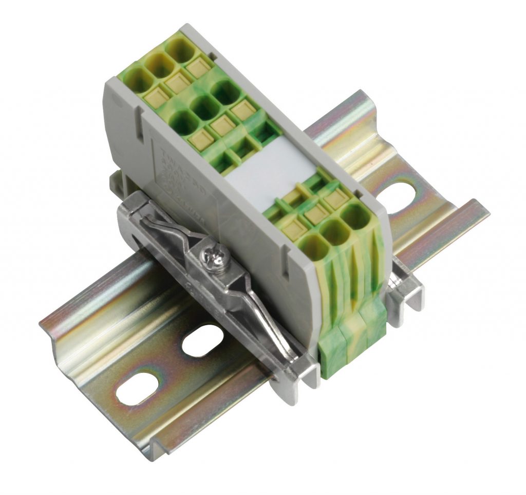 スチール製ないしは表面を導電処理したアルミ製のIEC35mmレールに取り付けることによってアースを取ることが出来る端子台です。