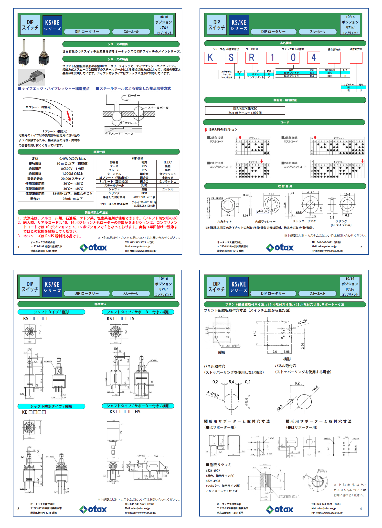 ロータリータイプ ロータリー KS/ KEシリーズ PDFダウンロードはこちら ■ DIPスイッチ豆知識 DIPスイッチとは? DIPスイッチはDual In-line Package スイッチの略です。半導体などに使われるDual In-line Packageとスライド型のDIPスイッチが同じ形状をしていたためこう呼ばれます。操作用スイッチの中でも、他のスイッチとは異なりパネル表面に取り付けられることはごく稀で、プリント基板上に取り付けられ内部装置に組み込まれるスイッチです。デジタル信号の制御を主目的とし、プログラムの設定、回路切り替えや回路チェックなどの用途に使用されています。 日本国内で月に1,000万個のニーズ DIPスイッチは最初1970年代に米国で発明されました。日本では、自動販売機の料金設定用のスイッチとして登場して2024年時点で40年以上の歴史があります。プログラミング用設定スイッチとして飛躍的に用途が拡大し、現在では国内で月に1,000万個の需要があるといわれています。 70%近くを占めるスライド型 DIPスイッチは、操作部の形状によってスライド型、ピアノ型、ロータリー型に大別され、用途によって使い分けられていますが、スライド型が一般的で全体の7割弱、主に4極と8極が使用されています。ロータリー型は、ダイヤルを回すと2進数換算でOFFを0、ONを1として、順番に000→001→010→011→…→111のように出力が変わって行きます。